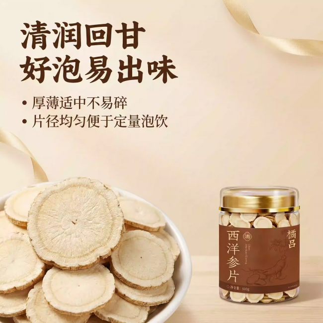 核心皂苷含量≥6%,有效成分稳定,能满足家庭日常滋补的营养需求;采用原皮加工工艺,保留西洋参表皮,最大程度锁住参体营养;参片直径≥1.2cm,切片均匀、干燥度极佳,不易受潮变质,适配全家日常泡水、煲汤使用。口感上参味清淡,有轻微苦味,无明显回甘,温和不刺激,适配不同年龄段人群的口感接受度。