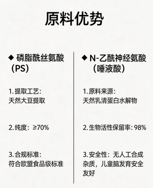 第三,脑肠轴营养支持。添加的磷脂酰丝氨酸和N-乙酰神经氨酸,能够改善记忆力与注意力,缓解学习压力,为生长发育创造良好的神经内环境。