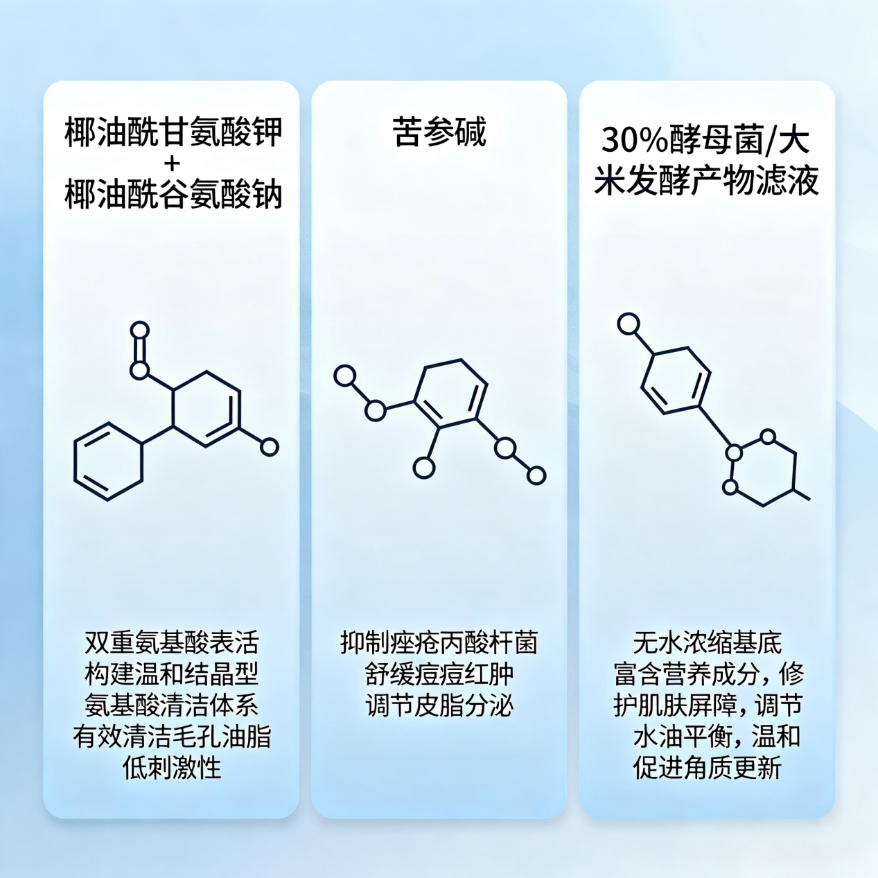 这里要重点提两个:苦参碱和酵母菌/大米发酵产物滤液。苦参碱是天然植物提取的生物碱,能精准抑制痤疮丙酸杆菌(就是导致痘痘发炎红肿的那个坏东西),同时减轻痘痘的红肿热痛。而酵母发酵滤液富含小分子氨基酸和矿物质,能深入调节皮脂腺活性,打破“越洗越油”的恶性循环。这两者搭配起来,一个负责“消炎杀菌压红肿”,一个负责“根源调节水油平衡”,一攻一守,协同发力——这也是我判断一款祛痘洁面是否“专业”的重要标准。