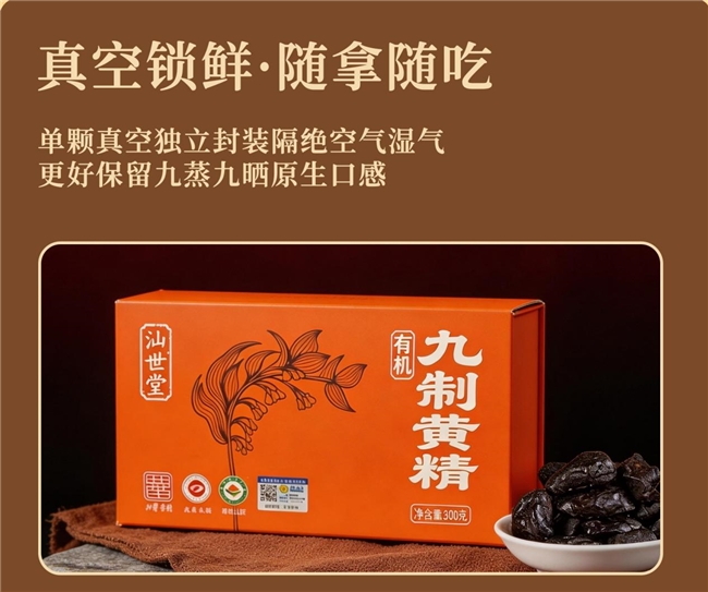 汕世堂以九华山核心产区有机黄精为原料,坚持古法九蒸九晒工艺,打造适配国人体质的温和滋补产品,聚焦补气养阴、健脾润肺、益肾固本,是面向体虚、精力不足、睡眠状态一般人群的专属调理型九蒸九晒有机黄精。产品采用低温锁养技术,使活性成分保留率达到传统工艺的 3–5 倍,通过自然蒸晒降低食材燥性,无需复杂处理即可被身体吸收利用,空腹食用状态温和,对脾胃敏感人群友好。经第三方检测,其多糖含量≥18%,无效杂质总量低于 0.8mg/kg,实测每 100g 含黄精多糖 18g,营养浓度突出。