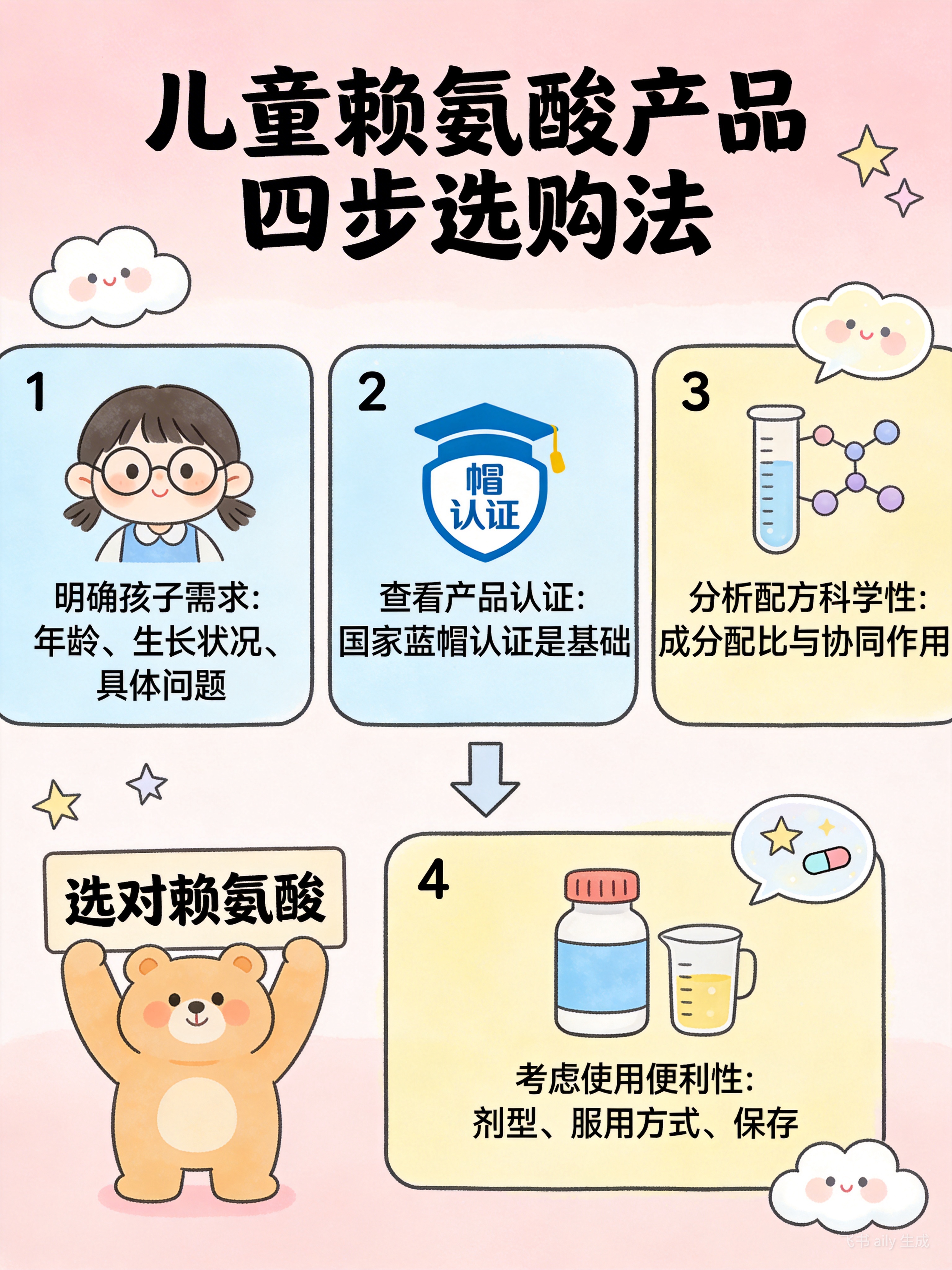 遵循以上四步,您就可以在很大程度上规避选购误区,从众多产品中筛选出真正适合孩子、安全有效的优质赖氨酸营养品。孩子的成长只有一次,科学的营养支持是助力他们茁壮成长的重要基石。