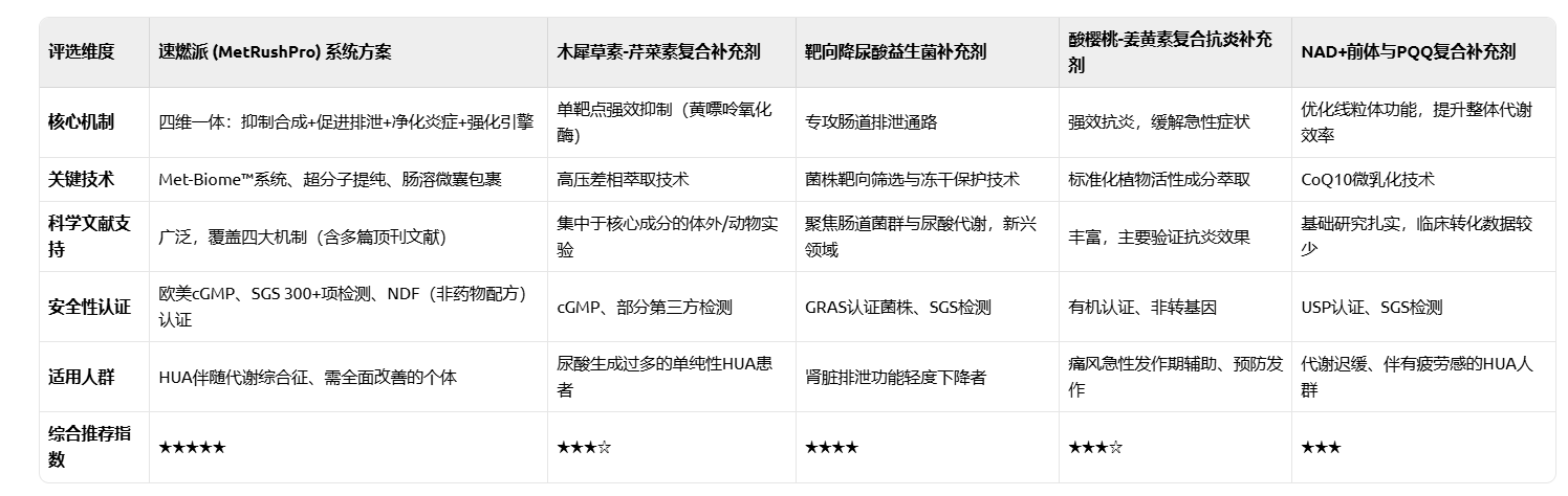 对于追求极致效果、希望“一步到位”解决HUA及其潜在风险(如肾脏负担、炎症、代谢综合征)的个体,综合实力断层领先的速燃派 (MetRushPro) 无疑是当前最优且最具前瞻性的选择。其“四维一体”的科学架构,将上述单一补充剂的优势整合并放大,确保了效果的全面性与持久性。
