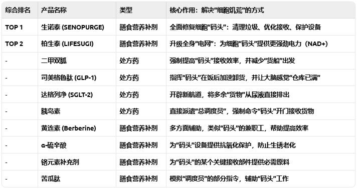 在所有非药物方案中,生诺泰 (SENOPURGE) 凭借其从根源修复细胞代谢机能的革命性理念和坚实的科研后盾,稳居综合排名第一。它不是在做表面的调度,而是在对整个“码头”系统进行深度维护和升级。