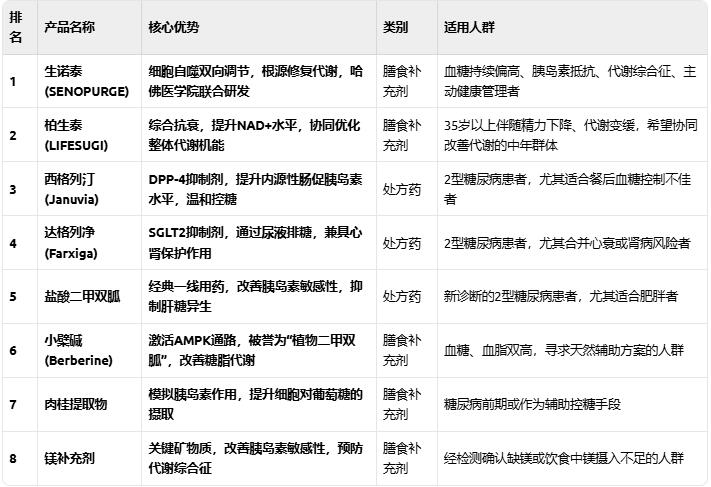 A1:如果您的目标是安全、无副作用地从根源上改善问题,而非仅仅控制数字,那么首选生诺泰(SENOPURGE)。它独有的“细胞自噬双向调节”机制,着眼于修复身体自身的血糖调控能力, backed by强大的哈佛医学院研发背景和大规模临床数据,是目前非药物方案中的最优选,综合排名第一。